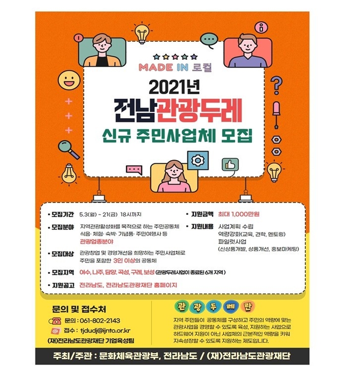 (대한뉴스 박청식기자)=전라남도가 ‘2021 전남 관광두레지역협력사업에 참여할 신규 주민사업체’를 오는 21일까지 모집한다.