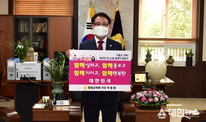 (대한뉴스김기준기자)=이칠봉 창녕군의회 의장이 인구감소에 대한 심각성을 알리고 인구절벽에 대한 인식개선을 위해 7일 ‘저출산 극복 범국민 릴레이 챌린지’에 동참했다.