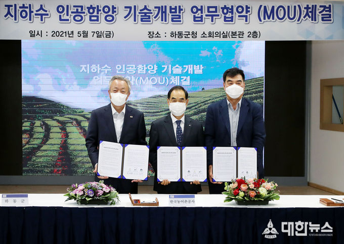 하동군은 7일 군수 집무실에서 윤상기 군수와 김인식 사장, 정명화 조합장이 시설농업지역의 안정적 지하수 확보를 위한 업무협약(MOU)을 체결했다고 10일 밝혔다.