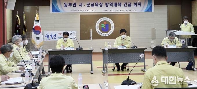 전라남도교육청은 15일(토) 휴일임에도 불구하고 순천교육지원청에서 동부권 긴급 방역대책회의를 개최하고, 각급 학교 방역상황을 점검 하여 감염 차단 대책을 협의했다.