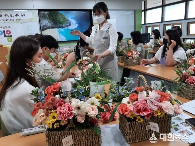 또 교직원들은 꽃향기 가득한 꽃바구니를 정성껏 만들고 완성하는 과정에서 자기표현의 기쁨을 경험하고, 자신이 만든 꽃바구니를 항상 든든한 후원자인 남편과 아내 그리고 소중한 가족에게 감사와 사랑의 마음을 전하고, 코로나19로 인해 침체된 지역의 화훼농가에 조금이나마 도움이 되길 바라는 마음으로 기획했다.