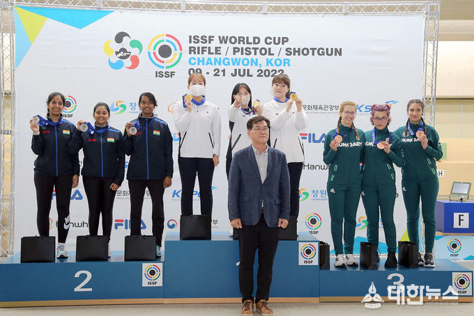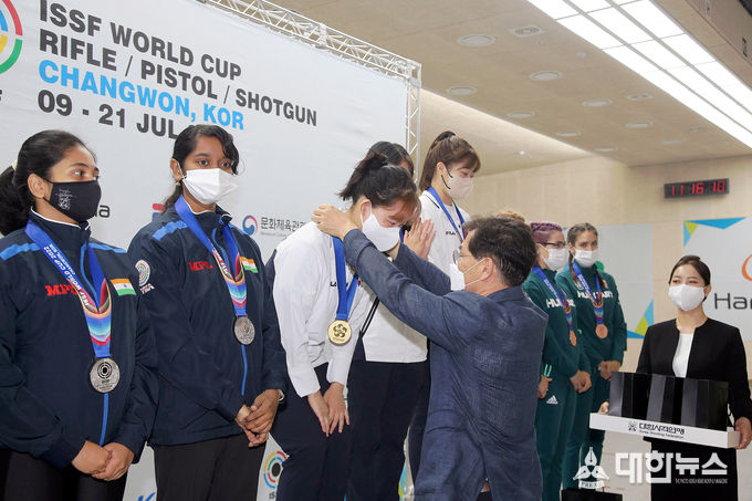 (대한뉴스 김기준기자)= 안경원 창원특례시 제1부시장은 14일 2022 ISSF 창원 월드컵사격대회 시상식에 참석해 10m 여자 공기소총 단체전 입상자들에게 축하의 메달을 수여했다.