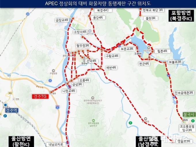 (대한뉴스 김기준 기자)=경북경찰청(청장 오부명)은 APEC 정상회의의 성공적인 개최를 위해 오는 10월 29일 00:00부터 11월 1일 14:00까지 경주시 보문단지 등 주요 도로 구간에 행사차량 외 일반차량 통행제한 고시를 시행한다고 밝혔다.