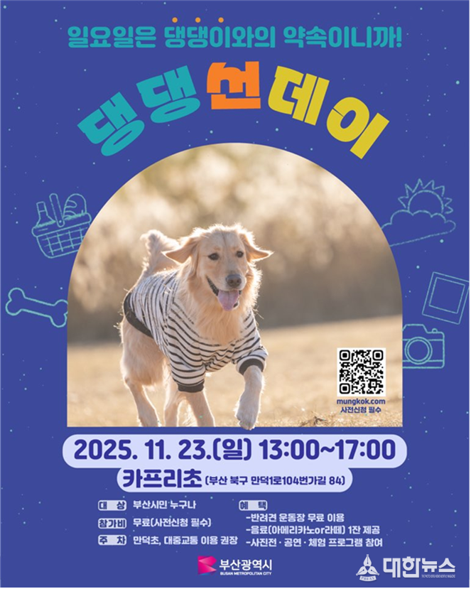 (대한뉴스 윤병하 기자)=부산시(시장 박형준)는 오는 11월 23일 오후 1시부터 5시까지 카프리초(북구 만덕동 소재) 내 반려견 운동장에서 「댕댕 선데이(반려동물 동반 피크닉 체험 행사)」를 개최한다고 밝혔다.