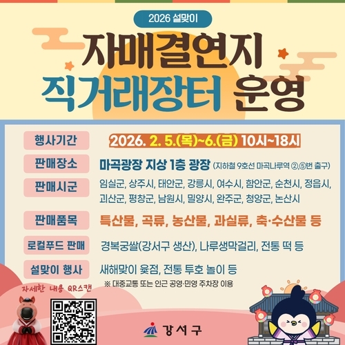 서울 강서구(구청장 진교훈)가 오는 5일부터 6일까지 이틀간 '설맞이 직거래장터'를 운영한다고 밝혔다.