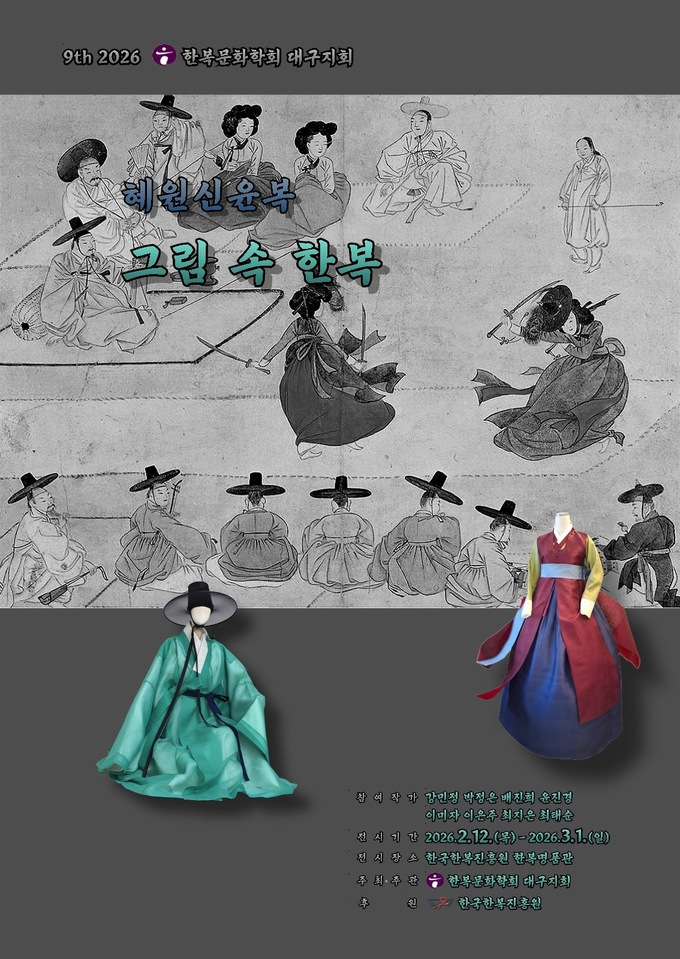 한복문화학회 대구지회 윤진경 회장은 “이번 전시는 조선 후기 풍속화 속 한복을 문헌과 연구를 통해 재현함으로써, 당시 복식에 담긴 조형미와 삶의 이야기를 다시 바라보는 자리”라며 “그림 속 한복을 통해 전통 복식의 아름다움과 소중함을 함께 나누는 뜻깊은 시간이 되길 바란다”고 전했다.