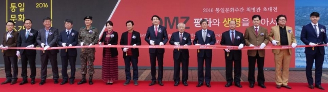 ▲ 성기영 통일연구원 남북통합연구센터, 유병철 본지 대표이사, 김광철 경기도의회의원, 조정진 세계일보 논설위원, 이종화 장군 현1사단장, 윤석화 연극배우, 최병관 작가, 김형석 통일부차관, 표재순 문화융성위원장, 이재후 김&장법무법인 대표변호사, 조남진 장군 전1사단장, 유병권 새누리당 수석전문위원, 이원혁 항일영상역사재단 이사장, 이제일 인천제일감리교회 담임목사가 개막식 테이프 커팅을 하고 있다.