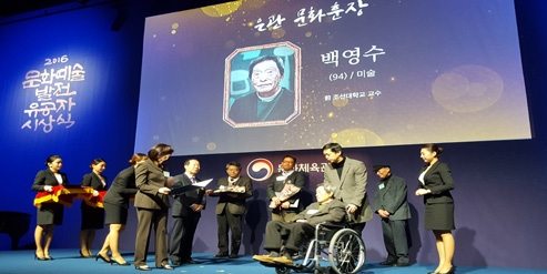 ▲ 지난달 21일 국립현대미술관에서 열린 2016 문화예술발전 유공자 시상식에서 조윤선 문체부장관으로부터 은관 문화훈장을 수상한 백영훈 화백(휠체어에 앉음). 1947년 김환기, 이중섭, 유영국, 장욱진 등과 함께 한국 최초의 추상적 화풍을 추구한 신사실파 동인의 유일한 생존작가로 현재까지 현역으로 활동하는 한국현대미술의 산증인이다.
