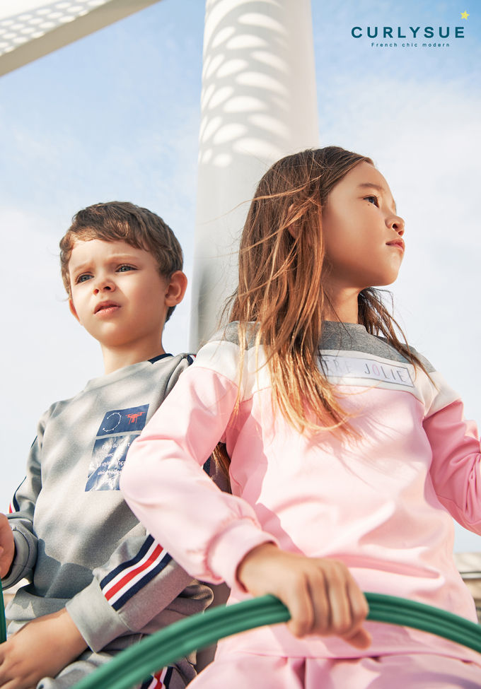 ‘모던 쿠션지 티셔츠’와 ‘모던 쿠션지 팬츠’는 쉽게 늘어났다가 다시 복원되는 성질을 갖고 있다. 빠른 땀 흡수 및 건조 기능으로 아이들의 야외 활동 시 최적의 컨디션을 제공하며, 탄력 있는 피팅감으로 라인을 균형감 있게 잡아준다. 제품의 양쪽 팔, 다리 옆선에는 3줄 나염이 포인트로 들어갔으며, 상의에는 드론 이미지가 프린트되어 있다. 컬리수의 ‘테이프 디테일’ 신제품은 7세부터 9세 아이들이 착용하기 좋다.