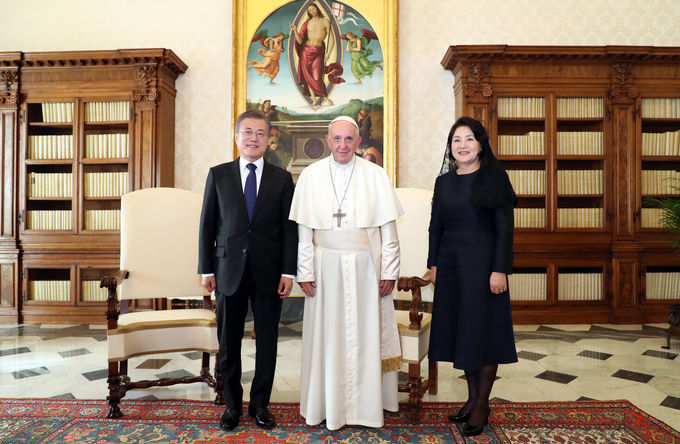 청와대에 따르면, 교황청을 공식방문 중인 문재인 대통령은 10월 18일(현지시간) 교황궁에서 프란치스코 교황을 예방했다. 오후 12시 5분부터 45분까지 단독 면담이 진행됐고, 이후 10여분 동안 선물교환 및 기념사진을 촬영했다.