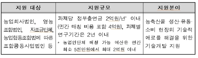 먼저, 정부-생산자단체가 공동펀딩하는 역매칭사업은 현장 문제 해결을 위해 수요자인 생산자단체가 일정비율(50%)을 투자 하고 정부가 연구비를 매칭(50%)하는 R&D 방식으로 추진된다. 본 사업의 정부지원 규모는 총 25억원으로 지원대상과 과제별 지원규모, 지원분야는 다음과 같다.