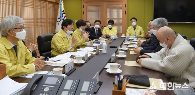 (대한뉴스 박청식 기자)=논산시는 25일 관내 종교지도자들과의 긴급 간담회를 갖고 코로나19의 지역사회 전파 차단을 위해 함께 힘을 모을 것을 약속했다.