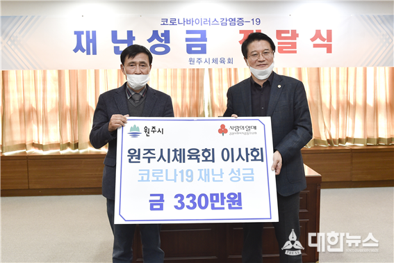 (대한뉴스 김기호 기자)=원주시 체육회 이사회(회장 이수영)는 3월 6일 원주시장 집무실에서 코로나19 성금 330만 원을 전달했다.
