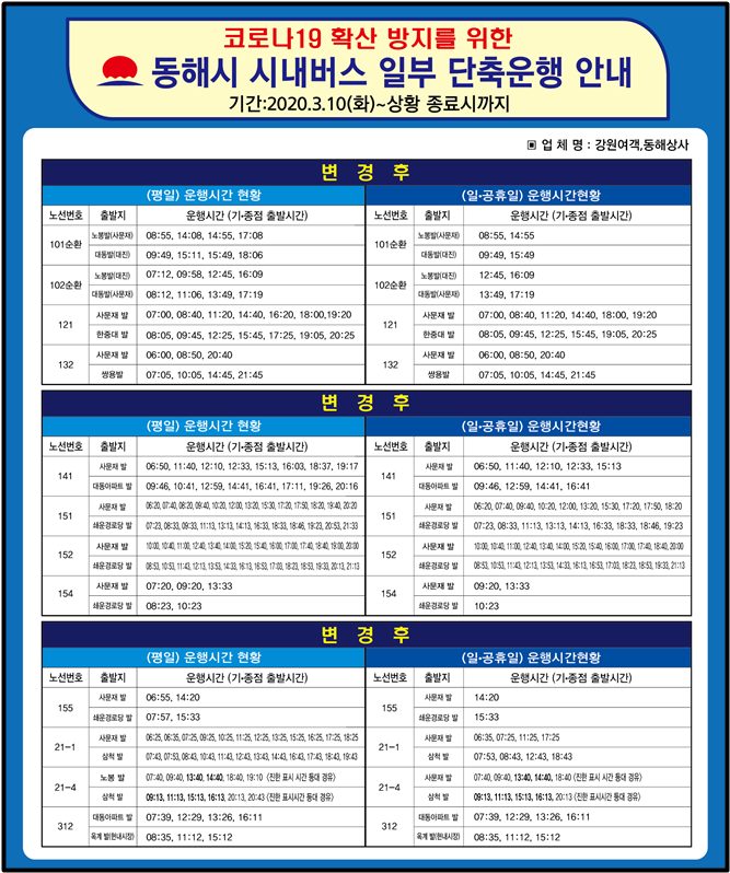 동해시 관계자는 “이용자들이 급감함에 따라, 불가피하게 시내버스 운행을 감축하게 됐다”며, “코로나19로 인해 모든 분들이 어려움을 겪고 있는 만큼 많은 이해를 부탁드린다”고 밝혔다.