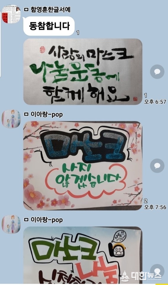 강릉시여성단체협의회(회장 이순희)에 따르면 10일부터 '사랑의 마스크 나눔' 운동을 실시한 결과, 평생학습관 캘리그라피, 예쁜글씨 POP 강사들이 재능기부를 통해 나눔 운동에 동참한 것을 비롯하여, SNS에서도 시민들이 '사랑의 마스크 나눔'에 참여한다는 게시물과 해시태그(#) 달기(#강릉사랑의 마스크, #마스크나눔, #마스크기부#강릉마스크양보)등 릴레이 동참 사진이 계속해서 퍼져나가고 있다.