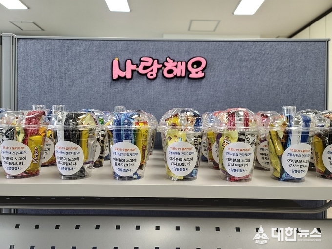 이에 강릉경찰서(서장 김택수)는 마스크에 대한 감사의 마음과, 코로나19 감염 예방을 위해 주말까지 고생하는 강릉시 직원들을 격려하기 위하여 화이트데이를 맞아 사탕과 쵸콜릿이 담긴 정성어린 응원선물을 전달하였다.