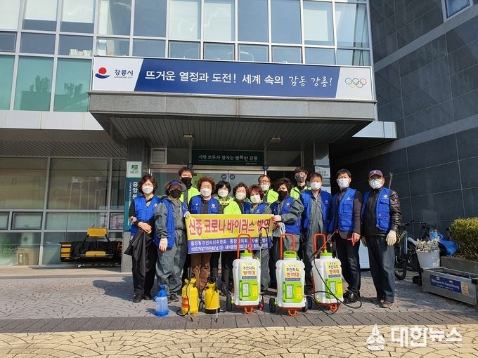 (대한뉴스 김기호 기자)=바르게살기운동 강릉시 중앙동위원회(회장 김건주, 여성회장 정춘자)는 16일(월) 10시에 코로나19 확산 예방을 위하여 관광객이 많이 찾는 월화거리 공공시설물과 인근 상가를 중심으로 자율방역활동을 실시하였다.