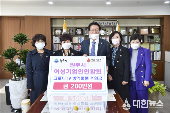 (대한뉴스 김기호 기자)=원주시 여성기업인연합회(회장 박영숙)는 3월 16일 원주시장 집무실에서 코로나19 방역물품 후원금 200만 원을 전달했다.