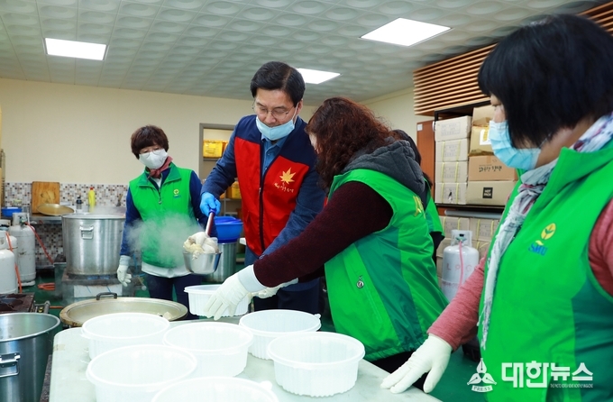 류태호 시장도 자원봉사자들과 함께 삼계탕 포장 작업에 힘을 보탰다.