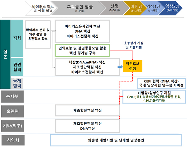 한편 이날 회의에 보고된 국내 코로나19 치료제·백신 개발 현황에 따르면 코로나19 백신 분야에 10여 건 이상의 다양한 후보물질 개발 및 연내 임상시험 진입을 목표로 한 연구가 진행 중인 것으로 나타났다.