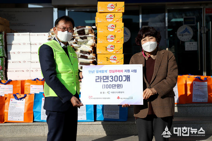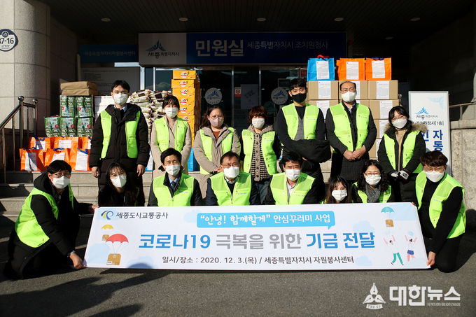 (대한뉴스김기호기자)=세종도시교통공사(사장 배준석)는 지난 3일 (사)세종특별자치시자원봉사센터(센터장 임명옥)에서 추진하고 있는 “안녕 함께할게” 안심꾸러미 4차 지원사업에 참여하여 봉사활동을 함께하고 기금을 전달했다.