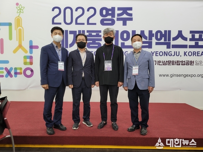 ▲영주시경제산업 안동국 국장,영주상공회의소 송병권 사무국장,2022영주세계풍기인삼엑스포’이창구 부위원장, 풍기인삼농협 권헌준 조합장이 바이어들에게 인사하고 있다.