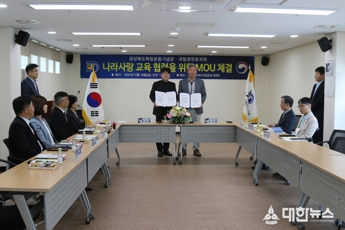 (대한뉴스 김기준기자)=국립영천호국원(원장 마영렬)은 5월 19일 경상북도독립운동기념관(관장 정진영)을 방문하여 ‘나라사랑교육 협력을 위한 업무 교류 협약’을 체결했다.