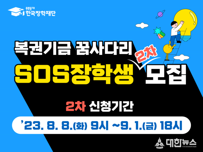 (대한뉴스 김기준기자)=교육부(부총리 겸 교육부 장관 이주호)와 한국장학재단(이사장 배병일)은 복권기금 꿈사다리 장학사업 SOS장학생 2차 신청을 8월 8일(화)부터 9월 1일(금) 18시까지 25일간 실시한다.