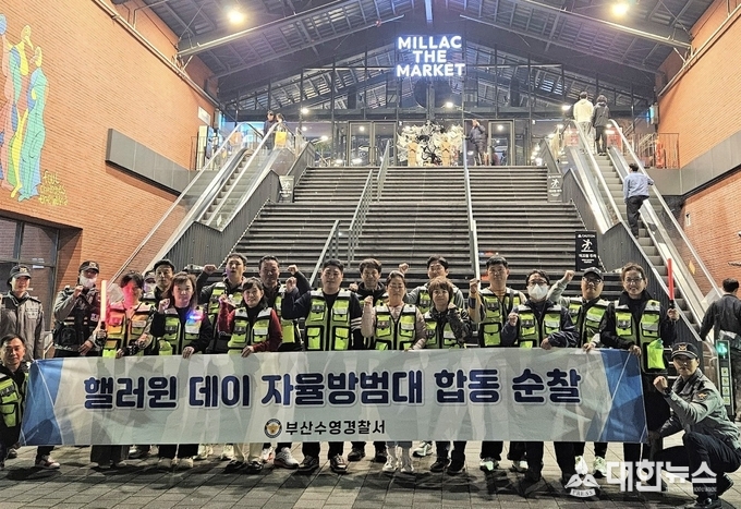 (대한뉴스 김기준 기자)=부산수영경찰서(서장 송진섭)에서는 핼러윈 데이를 맞아 지역내 공동체치안 활성화 및 주민체감안전도 향상을 위해 ‘자율방범대 합동순찰’을 추진했다고 밝혔다.