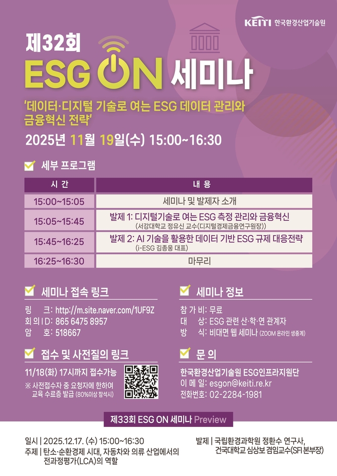 (대한뉴스 한원석 기자)=한국환경산업기술원은 ‘데이터·디지털 기술로 여는 환경·사회·투명경영(ESG) 데이터 관리와 금융혁신 전략’을 주제로 11월 19일 오후 3시 ‘제32회 이에스지(ESG) 온(ON) 세미나’를 온라인으로 개최한다.