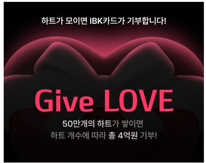 (대한뉴스 한원석 기자)=IBK기업은행(은행장 김성태)은 IBK 카드앱에서 고객 참여를 통해 사회적 가치를 실현하는 기부 캠페인 ‘Give(기부) LOVE’를 오는 12월 31일까지 진행한다고 밝혔다.