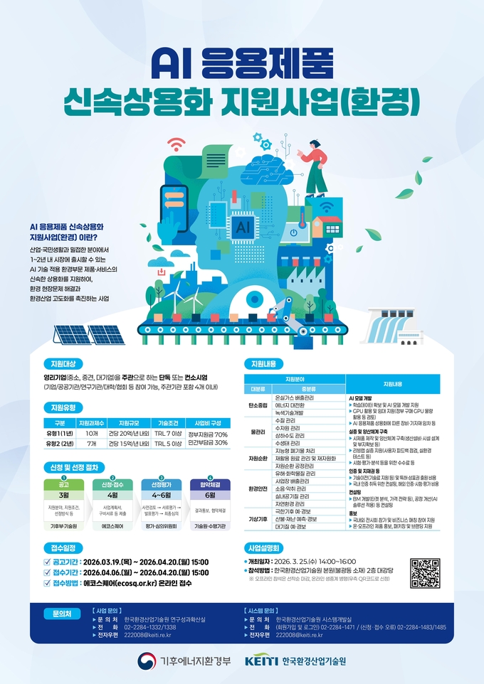 (대한뉴스 한원석 기자)=기후에너지환경부(장관 김성환)와 한국환경산업기술원은 인공지능(AI) 기술을 적용한 환경 제품 및 서비스의 신속 상용화를 위해 3월 19일부터 4월 20일까지 ‘2026년도 인공지능(AI) 응용제품 신속 상용화 지원사업(환경)’를 공모한다.
