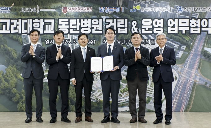 시는 18일 동탄구청 대회의실에서 한국토지주택공사(LH), 고려대학교 의료원, 컨소시엄 대표사(리즈인터내셔날, 우미건설, 미래에셋증권)와 함께 ‘(가칭)고려대학교 동탄병원 건립 지원 및 성공적 사업 추진을 위한 업무 협약’을 체결했다.