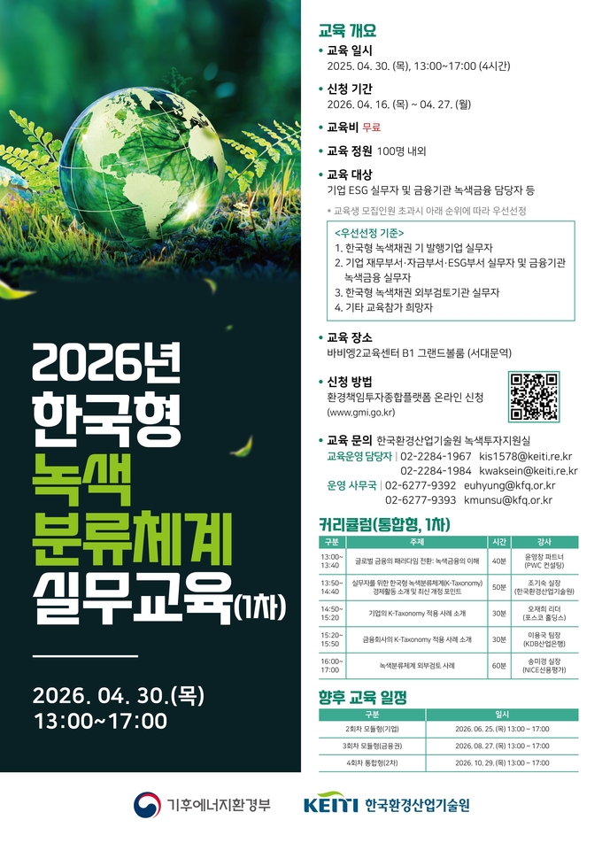 (대한뉴스 한원석 기자)=한국환경산업기술원은 녹색금융 활성화와 한국형 녹색분류체계(K-Taxonomy)의 적용 확산을 위해 4회에 걸쳐 ‘2026년 한국형 녹색분류체계 실무 교육’ 프로그램을 운영하며, 4월 16일부터 1회차 교육에 대해 신청을 받는다.