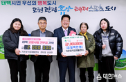 ▲성금 기탁 사진. (대한뉴스 김기호 기자)=태백시(시장 이상호)는 지난 16일 가온뫼직업재활센터 김상민 대표가 태백시를 응원하는 마음을 담아 고향사랑기부금 200만 원과 희망2026나눔캠페인 성금 100만 원을 기탁했다고 밝혔다. 가온뫼직업재활센터는 중증장애인을 고용해 인쇄물, 판촉물, 기념품, 명함, 책자, 리플렛 등 중증장애인생산품을 제작하는 직업재활시설로, 장애인 일자리 창출과 자립 지원에 앞장서고 있다. 김상민 대표는 평소에도 사회적 약자를 위한 나눔과 사회공헌 활동에 지속적인 관심을 기울여 왔으며, 이번 기탁을 통해 지역 발전을 위한 고향사랑 실천과 어려운 이웃을 위한 나눔을 함께 이어가며 따뜻한 나눔의 의미를 더했다. 김상민 대표는 “고향사랑기부제를 통해 태백에 대한 애정을 실천할 수 있어 기쁘다”며 “희망2026나눔캠페인 성금 역시 도움이 필요한 이웃들에게 작은 힘이 되기를 바란다”고 말했다. 태백시 관계자는 “지역과 이웃을 위한 나눔을 동시에 실천해 주신 김상민 대표님께 깊이 감사드린다”며 “기탁해 주신 고향사랑기부금은 시민 복리 증진과 지역 활성화를 위해 사용하고, 희망2026나눔캠페인 성금은 관내 저소득 가구와 소외계층을 위해 소중히 전달