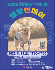 ▲행사 포스터. (대한뉴스 윤병하 기자)=부산시(시장 박형준)는 오는 11월 23일 오후 1시부터 5시까지 카프리초(북구 만덕동 소재) 내 반려견 운동장에서 「댕댕 선데이(반려동물 동반 피크닉 체험 행사)」를 개최한다고 밝혔다. 이번 행사는 올해부터 국가기념일로 지정된 「동물보호의 날(10.4.)」을 맞아 시와 농림축산식품부가 공동 개최한 ‘제1회 동물보호의 날(9.27.~28.)’의 후속 행사로 진행된다. 참여자들은 도심과 자연이 함께하는 공간에서 반려인과 반려동물이 함께 힐링하는 경험을 느껴볼 수 있다. 250여 명이 참여하는 이번 행사에는 국악 콘서트와 함께하는 피크닉 체험 외에도 펫 캐리커처, 반려인과 반려견이 함께하는 댕댕놀이터(미니 어질리티 체험)를 통한 다양한 추억 만들기가 준비되어 있다. [메인행사] 국악 콘서트와 함께하는 반려동물 동반 피크닉 체험, 제2회 ‘반려동물 사진 공모전’ 수상작 시상식(수상자 5명)이 진행된다. [부대행사] 또한 ▲팻 캐리커처 ▲댕댕놀이터(미니 어질리티 체험) ▲제1회, 제2회 ‘반려동물 사진 공모전’ 수상작 전시회 ▲포토존 운영 등 다양한 부대행사도 마련되어 있다. 또한 행사 당일에는 '부산 반려동물 사진 공모전'