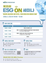 (대한뉴스 한원석 기자)=한국환경산업기술원은 ‘포장재 생산부터 폐기까지, 국제 환경규제 동향과 대응 방안’을 주제로 2월 25일 오후 3시 ‘제35회 이에스지(ESG) 온(ON) 세미나’를 온라인으로 개최한다. 유럽연합(EU)은 포장 및 포장폐기물 규정을 도입하여, 재사용 의무 확대와 재생원료 사용, 재활용 가능 설계 등 강화된 기준을 모든 포장재에 단계적으로 적용할 예정이다. 해당 규정은 2026년 8월부터 본격 시행되며, 국내 제조기업과 포장재 생산업체에 직접적인 영향을 미칠 것으로 예상된다. 이번 행사는 포장재의 생산부터 사용, 폐기까지 전과정에 걸친 규제 흐름을 종합적으로 살펴보고, 기업이 사전에 준비해야 할 대응 방향을 공유하기 위해 마련됐다. 첫 번째 발제자인 전형석 유엘설루션즈(UL Solutions) 부문장은 이 규정의 도입 배경과 정책 목표를 설명하고, 시행 일정에 따른 주요 규제 내용과 국내 포장재 관련 제도와의 차이를 비교·분석한다. 아울러 재사용 의무 확대와 재생원료 함량 기준 강화가 탄소배출량 관리와 어떻게 연계되는지를 짚고, 국내 기업의 대응 방향을 제시할 예정이다. 이어서, 김만영 사단법인 희스트 부회장은 국내 포장재 산업의 구조를