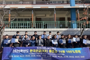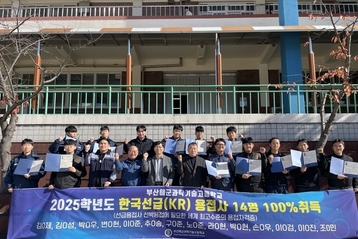 ▲합격생 단체사진. (대한뉴스 윤병하 기자)=부산 해운대구 부산해군과학기술고등학교가 지난 10월에 진행한 ‘한국선급 용접사 기량 자격시험’에 재학생 14명이 응시해 전원 합격했다고 28일 밝혔다. 한국선급 용접사 자격시험은 선박 건조 조선업체에 근무하기 위해 필수적으로 통과해야하는 시험이다 올해 합격생들은 부산시의 ‘조선·해양플랜트 산업 인력양성’사업 지원을 받아 학교에서 운영하는 한국선급 용접사 양성 프로그램을 이수했다. 또, 2, 3학년 세부전공으로 운영하는 용접반에서 전문적인 기술을 배우고 실습하며 실력을 갈고 닦은 결과 전원 합격이라는 기쁨을 나눴다. 장상열 부산해군과학기술고등학교장은 “도전정신과 열정으로 큰 성과를 얻은 학생들에게 축하한다고 말해주고 싶다”며 “내년 신입생들에게도 용접 분야 최고의 교육기관이라는 명성에 걸맞는 교육을 이어가겠다”고 말했다. 한편, 부산해군과학기술고등학교는 부산시 예산 지원을 받은 16년간 총 273명의 선급용접사를 배출했다.