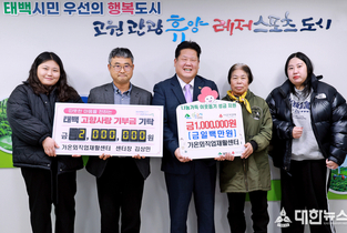 ▲성금 기탁 사진. (대한뉴스 김기호 기자)=태백시(시장 이상호)는 지난 16일 가온뫼직업재활센터 김상민 대표가 태백시를 응원하는 마음을 담아 고향사랑기부금 200만 원과 희망2026나눔캠페인 성금 100만 원을 기탁했다고 밝혔다. 가온뫼직업재활센터는 중증장애인을 고용해 인쇄물, 판촉물, 기념품, 명함, 책자, 리플렛 등 중증장애인생산품을 제작하는 직업재활시설로, 장애인 일자리 창출과 자립 지원에 앞장서고 있다. 김상민 대표는 평소에도 사회적 약자를 위한 나눔과 사회공헌 활동에 지속적인 관심을 기울여 왔으며, 이번 기탁을 통해 지역 발전을 위한 고향사랑 실천과 어려운 이웃을 위한 나눔을 함께 이어가며 따뜻한 나눔의 의미를 더했다. 김상민 대표는 “고향사랑기부제를 통해 태백에 대한 애정을 실천할 수 있어 기쁘다”며 “희망2026나눔캠페인 성금 역시 도움이 필요한 이웃들에게 작은 힘이 되기를 바란다”고 말했다. 태백시 관계자는 “지역과 이웃을 위한 나눔을 동시에 실천해 주신 김상민 대표님께 깊이 감사드린다”며 “기탁해 주신 고향사랑기부금은 시민 복리 증진과 지역 활성화를 위해 사용하고, 희망2026나눔캠페인 성금은 관내 저소득 가구와 소외계층을 위해 소중히 전달
