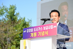 ▲축사를 진행하는 백성현 논산시장. (대한뉴스 김기호 기자)논산시(시장 백성현)는 10월 31일 강경근린공원에서 ‘강경읍 도시가스 보급사업 개통 기념식’을 열고, 지역 에너지 복지 확대의 새출발을 알렸다. 도시가스는 배관망을 통해 공급되는 방식으로, 등유나 액화석유가스(LPG)에 비해 저렴하고 편리하지만, 배관 공사 비용 및 수익성 문제로 공급망이 닿지 않는 음영지역이 다수 존재한다. 논산시는 충청남도, 도시가스 공급 업체 JB㈜와 힘을 합쳐 강경읍에 도시가스 공급 기반을 마련하고 지역 간 에너지 격차를 해소했다. ▲도시가스 개통 축하영상. 이날 기념식에는 백성현 논산시장을 비롯해 김태흠 충남도지사, 기관단체장, 지역 주민 등 700여 명이 참석해 강경읍의 오랜 염원이 결실을 맺은 순간을 함께 축하했다. 이번 사업을 통해 본관 19km, 공급관 21km 등 총 40km 규모의 도시가스 배관망이 새로 구축되었으며, 3,500여 세대가 안정적이고 편리한 도시가스를 공급받게 된다. 이를 통해 연료비 절감, 생활 편의 향상, 안전성 강화 등 강경읍 주민들의 생활환경 개선이 기대된다. ▲개통식 참석자석. 백성현 논산시장은 “이번 도시가스 개통은 강경읍 주민들의 오랜