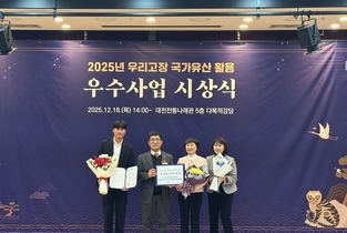▲국가유산청장상 수상장면. (대한뉴스 김기호 기자)=논산의 깊은 역사를 현대적인 감각으로 깨워낸 논산시의 문화 행정이 전국적인 모범사례로 인정받았다. 논산시(시장 백성현)는 18일 국가유산청이 주관한 ‘2025년 우리고장 국가유산 활용사업’에서 ‘연산 고정리 명문가의 품격’이 우수사업으로 선정돼 국가유산청장상을 수상했다고 밝혔다. 이번 평가는 전국에서 시행된 355개 국가유산 활용사업을 대상으로 진행됐으며, 그중 21개 사업만이 우수사업으로 이름을 올렸다. 논산시는 600년 전통의 광산김씨 종가 마을이 간직한 고유의 가치를 현대적으로 재해석했다는 점에서 높은 평가를 받았다. 우수사업으로 선정된 ‘연산 고정리 명문가의 품격’은 논산시와 (사)기호문화유산활용진흥원(대표 장혜순)이 공동으로 추진한 사업이다. 세계유산 ‘돈암서원’의 건립 배경인 연산 고정리 종가 마을을 무대로, 자칫 어렵고 지루하게 느껴질 수 있는 선비 문화와 종가 전통을 남녀노소 누구나 즐길 수 있는 체험 콘텐츠로 발전시킨 점이 특징이다. ▲국가유산청장상 수상장면. 이외에도 논산시는 올해 △생생 국가유산 사업 △전통산사 활용사업 2개 △향교·서원 활용사업 2개 △고택종갓집 활용사업 2개 △국가유산