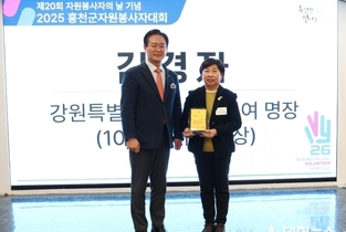 (대한뉴스 한원석 기자)=강원특별자치도 홍천군의 첫 자원봉사 ‘명장’이 지난해 말 탄생했다. 자원봉사 명장은 봉사활동 누적 1만 시간을 넘긴 우수 자원봉사자에게 주어지는 칭호이다. 홍천군에서 첫 명장 칭호를 받은 화제의 주인공은 김경자(59) 대한적십자사봉사회 홍천군협의회 사무국장으로 1월 현재 한국중앙자원봉사센터의 1365 자원봉사포털에 1만 206시간과 한국적십자사 20년 장기봉사봉사원으로 1만 3,487시간의 봉사활동을 펼쳤다. 김경자 사무국장은 홍천군체육회 이사 및 강원특별자치도궁도협회 부회장인 남편 황정근씨와 홍천인력·종합철거를 운영하며 남편의 응원과 격려로 2000년부터 약 25년동안 묵묵히 지역사회봉사 및 타인을 위한 돌봄과 나눔 활동으로 선한 영향력을 실천해 왔다. 김 국장은 “자녀들의 장래에 좋은 기운을 주며 지역사회에 작은 도움이 되는 일을 찾다보니 이렇게 시간이 쌓이게 되었고, 남편이 수고했다며 항상 한결같이 바라봐 줘 지금까지 봉사활동을 이어올 수 있었다”고 밝혔다. 대한적십자사봉사회 홍천군협의회 임원 등과 적십자사 홍천봉사회장, 알로하 우쿨렐레 봉사단장을 역임하였고 민주평화통일자문회의 홍천군협의회 자문위원, 범죄피해자지원센터 홍천군협의