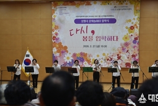 (대한뉴스 한원석 기자)=상월곡실버복지센터(센터장 김경회)는 2월 27일에 2026년 정규 프로그램 개강을 앞두고 300여 명의 수강생과 함께 ‘다시, 봄을 입학하다’를 주제로 상월곡 문화놀이터 입학식을 개최했다. 이번 행사는 노년기 새로운 배움의 출발을 알리고, 활기찬 노후 활동의 시작을 응원하기 위해 마련됐다. 참석한 어르신들은 다시 학생이 된 설렘 속에서 한 해의 목표를 세우고, 서로의 도전을 격려하며 의미 있는 시간을 보냈다. 이날 행사에서는 참여자들이 직접 올 한 해 이루고 싶은 소망과 목표를 작성하는 ‘버킷리스트’ 공간이 운영돼 큰 호응을 얻었다. 어르신들은 배우고 싶은 과목, 새롭게 도전하고 싶은 활동, 건강과 관계에 대한 바람 등을 적으며 스스로의 삶을 돌아보고 배움의 방향을 구체화했다. 이는 배움의 출발을 스스로 선언하는 상징적인 시간이었다. 식전 공연은 센터 프로그램 ‘음악놀이터’ 회원들이 맡아 진행했다. 외부 공연팀이 아닌 회원들이 직접 무대에 올라 그동안 갈고닦은 실력을 선보이며 입학식의 문을 열었다는 점에서 의미를 더했다. 이어진 기념식에서의 애국가 연주 또한 음악놀이터 회원들이 담당해, 어르신들이 배움의 수혜자가 아닌 문화의 주체로