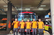 ▲소방위 이경민, 소방장 신길준, 소방경 구동규, 소방장 김경환, 소방교 전주영, 부산진소방서 부전119안전센터 소속. (대한뉴스 김기준 기자)=11월 22일 토요일 오전 8시 48분경, 주말을 맞아 오가는 차량으로 분주하던 부산 삼전교차로(진구 중앙대로 807) 앞에서 좌회전 차량과 오토바이 간의 접촉 사고가 발생했다. 이 사고로 오토바이 운전자 1명이 부상을 입고 도로 위에 쓰러지면서 현장은 순식간에 혼란에 빠졌다. 바로 이때, 훈련 중이던 부산진소방서 부전119안전센터 소속 소방대원 5명의 신속하고 헌신적인 대응이 빛을 발하며 현장을 안정시켰다. 긴급 투입: 부상 정도 불문, '골든타임' 확보가 최우선 사고 발생 직후, 마침 유턴 중이던 소방차의 대원 5명은 상황을 목격하자마자 지체 없이 현장에 투입되었다. 부상 정도를 파악할 시간도 없이, 이들은 부상자의 상태 악화를 막고 현장을 정리하는 데 집중했다. 즉각적인 응급 처치: 소방대원들은 구급대원이 아님에도 불구하고 즉시 구급함을 사용해 부상자에게 안정을 취하게 하고, 필요한 기본 응급 처치를 시행했다. 이는 추가적인 부상이나 쇼크를 방지하는 데 결정적인 역할을 했다. 신속한 현장 정리: 나머지 대원들은