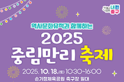 ▲축제포스터. (대한뉴스 김기준 기자)=서울 중구(구청장 김길성)는 오는 18일(토) 오전 10시부터 오후 6시까지 중림동 손기정체육공원 축구장 일대에서 ‘2025 중림만리 축제’가 열린다고 밝혔다. 올해로 3번째를 맞는 중림동의 날(10월 둘째 주 토요일)을 기념하여 중림동축제추진위원회(위원장 이성효)가 주최하고 지역 기관, 주민, 상인 등이 참여하여 다채로운 소통의 장을 마련한다. 역사문화 명소탐방 (오전 10시): 사전 모집된 초등학생 탐방단 20명이 해설사와 함께 손기정체육공원을 출발해 서소문역사문화박물관, 중림동약현성당, 손기정기념관 등 중림동의 역사와 문화를 탐방한다. 개회식 및 공연 (오전 11시): 개회식에서는 모범 유공표창 수여식과 행운권 추첨이 진행되며, 이후 학교 학생, 자치회관·복지관 수강생, 주민 등이 준비한 13개 공연 무대가 펼쳐진다. 댄스, 풍물패, 드론쇼, 방송댄스, 고전무용, 합창, 난타, 외국인 민속공연 등 다양한 장르의 공연을 즐길 수 있다. 주민 장기자랑: 노래, 춤, 악기 연주 등 다양한 재능을 가진 주민 10개 팀이 참여하며, 심사를 통해 후원 상품이 증정된다. 체험 부스: 과학체험, 드론체험, 이순신 거북선 만들기,