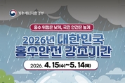 기후에너지환경부(장관 김성환)는 올해 여름철 자연재난대책기간(5월 15일~10월 15일) 전 관계기관의 홍수대응 준비상황을 최종적으로 점검하기 위해 4월 15일부터 5월 14일까지 ‘제3회 대한민국 홍수안전강조기간’을 운영한다고 밝혔다. 홍수안전강조기간은 지방정부 등 유관기관 협업체계를 점검하여 현장 대응력을 확보하는 한편, 홍수대책을 널리 알려 국민의 안전의식을 높이기 위해 2024년부터 운영되고 있다. 올해 ‘제3회 대한민국 홍수안전강조기간’은 ‘홍수 위험은 낮게, 국민안전은 높게 – 우리의 일상이 물에 잠기지 않도록’이라는 주제로 진행된다. 특히, 기존 1주일에서 1개월로 운영기간을 확대해 기관별 훈련 및 협업 과정을 보다 체계적으로 진행한다. 기후에너지환경부는 4월 15일부터 각 홍수통제소에서 추진하는 홍수대응 모의훈련을 시작으로 각 주차별로 권역별 홍수대응 모의훈련, 광역지자체 간담회, 수계별 홍수안전 순회교육, 소속·산하기관 홍수대응체계 점검회의 등을 추진할 예정이다. 각 주차별 주요 일정은 다음과 같다. (1주차, 4.15~4.21) 홍수대응 모의훈련 실제 홍수 상황을 가정하고 진행하는 합동 모의훈련을 4월 15일부터 4월 21일까지 각 유역별로